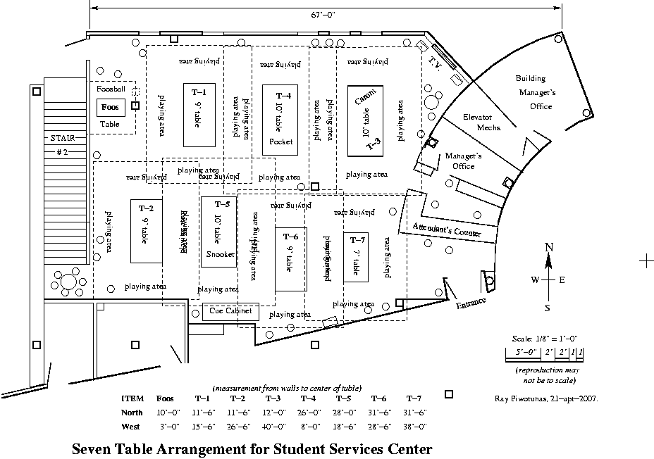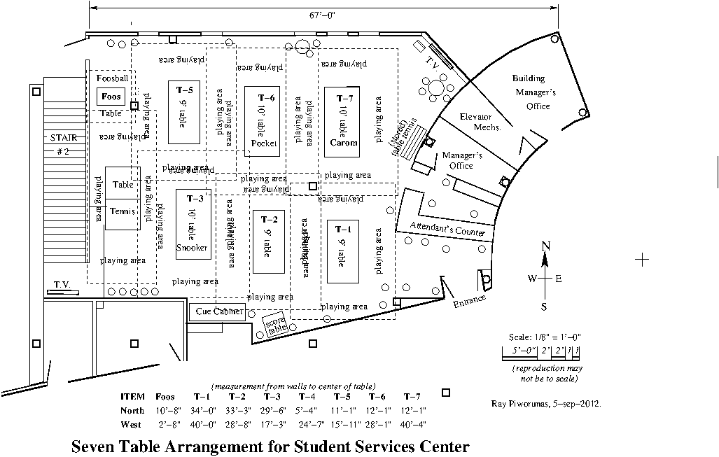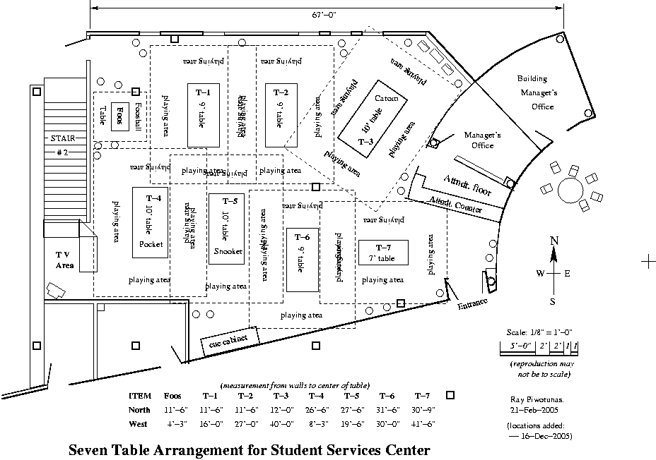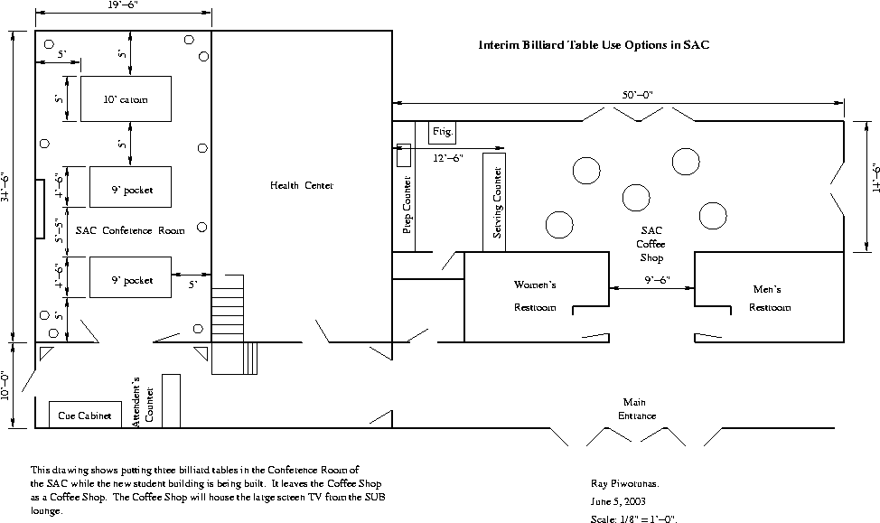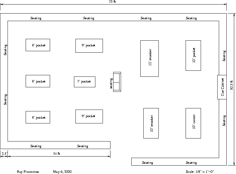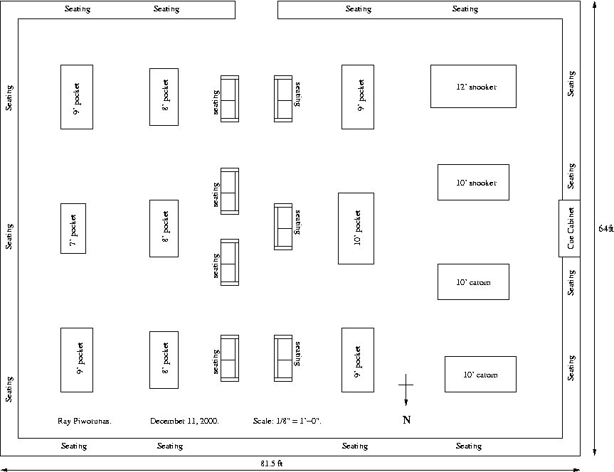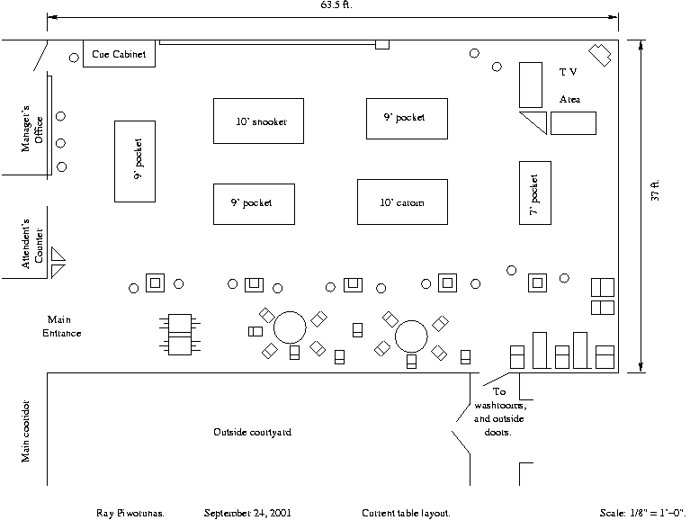 pocket tables, one 5'x10' carom table, one 5'x'10' snooker table,